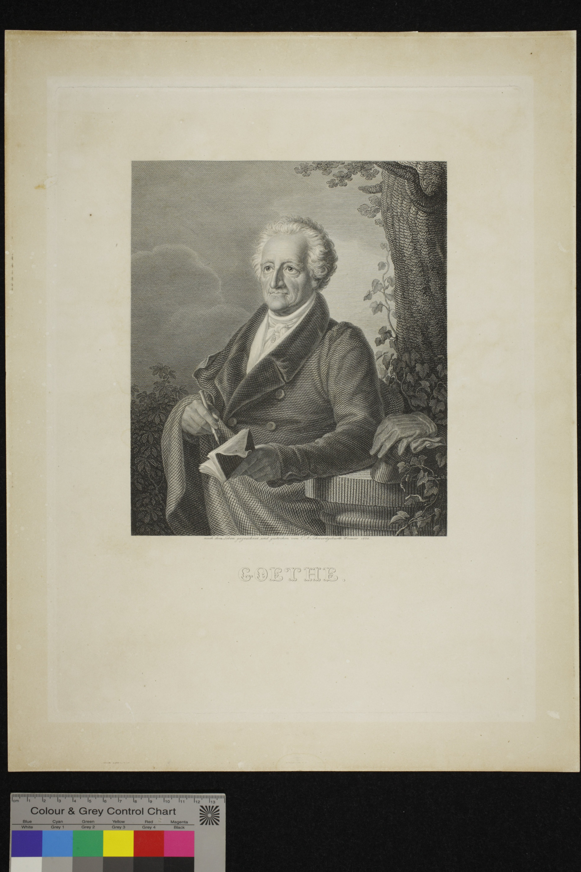 Im Januar 1832 legte Schwerdgeburth die Reinzeichnung vor. Goethe wünschte, „[d]ie Welt mit diesem Kupferstich bekannt zu machen […]. Machen Sie sich rasch an die Arbeit.“ Am 6. März wurden weitere Abmachungen getroffen; eine Pinselzeichnung entstand zur Vorlage. Leider wurde der Kupferstich Goethe nach dem Leben gezeichnet [18] erst nach dessen Tod vollendet.