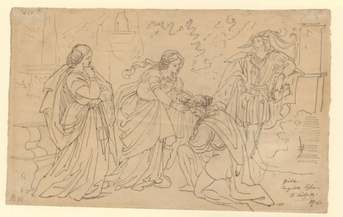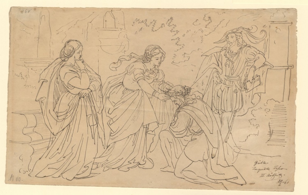 Carl Christian Vogel von Vogelstein orientierte sich bei der Illustration zu Goethes Tasso [19] an antiken Reliefs, die auch für David d’Angers [20, 21] vorbildlich waren. Thema und Darstellung der Dichtung sowie der Dichterpersönlichkeiten – Tasso auf der einen und Goethe auf der anderen Seite – stehen in der Tradition der griechisch-antiken Lobrede, der Panegyrik.