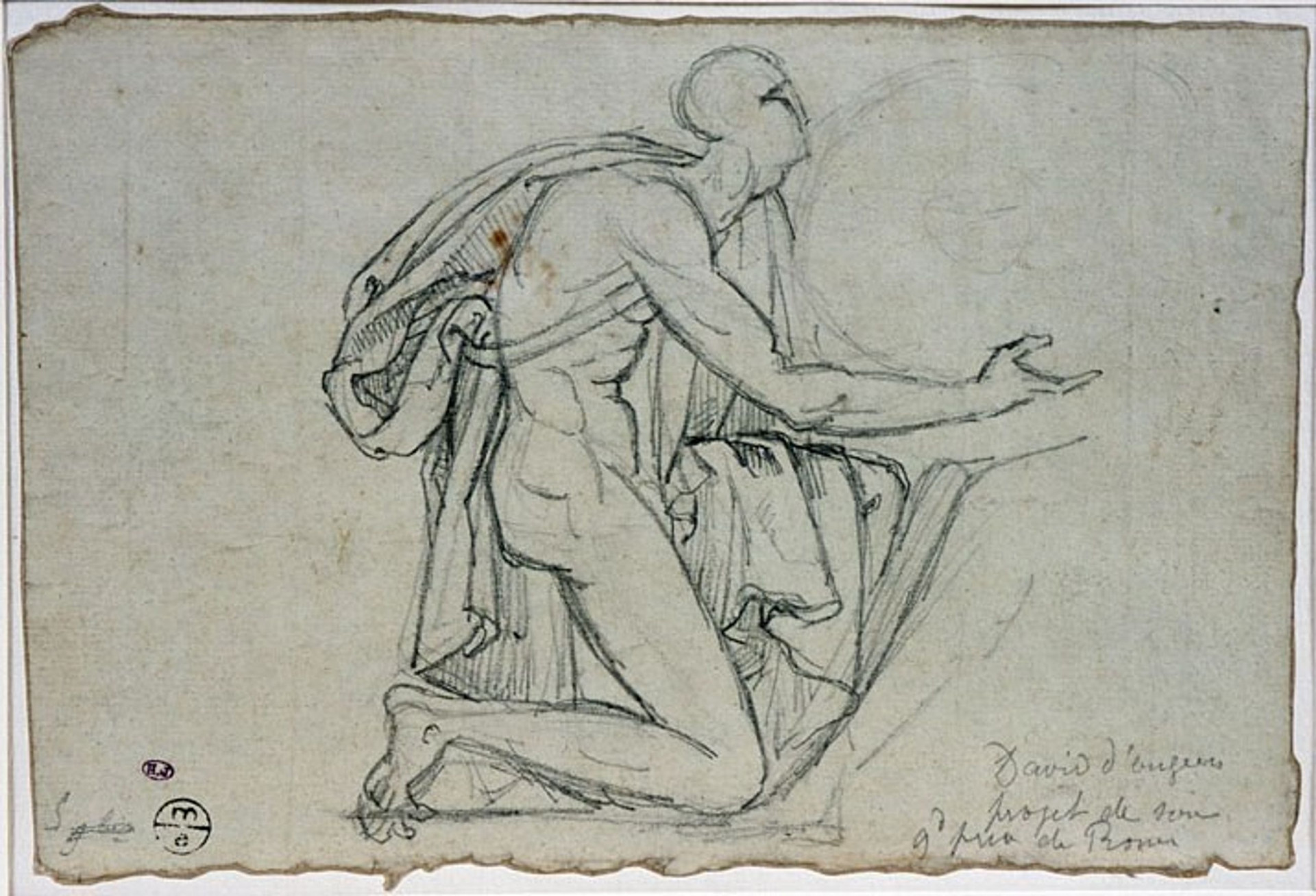 Die Darstellung der knienden Figur [20] verfestigte sich durch die zunehmende Kreidestärke schrittweise vom zarten zum kräftigeren Konturstrich. Die Verbesserungen, sogenannte Pentimenti, zeigen David d’Angers‘ Suche nach dem korrekten Muskelaufbau. Auch wird die Veränderung der Unterschenkel- und Fußstellung sichtbar. Mit Parallelschraffen, Kreuzlagen und Zick-Zack-Linien markierte er die verschatteten Gewandpartien in unterschiedlicher Intensität.